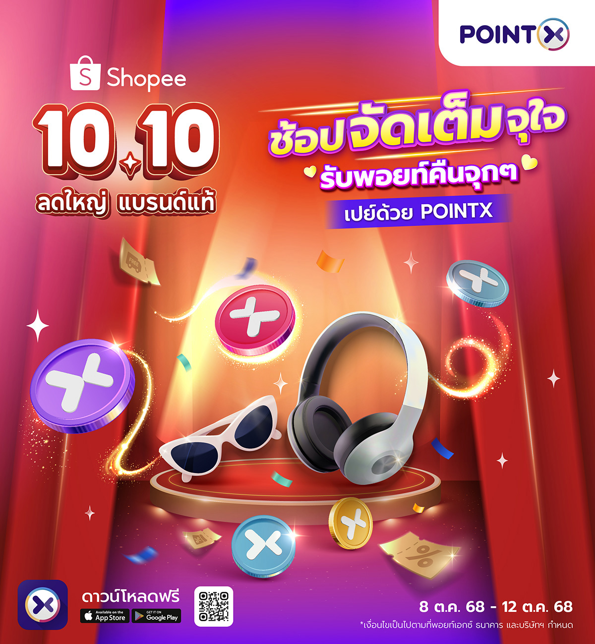 - วันที่ 10 ตุลาคม 2568 ทุกยอดใช้จ่ายด้วยคะแนน POINTX รับคะแนนพิเศษคืน 50%