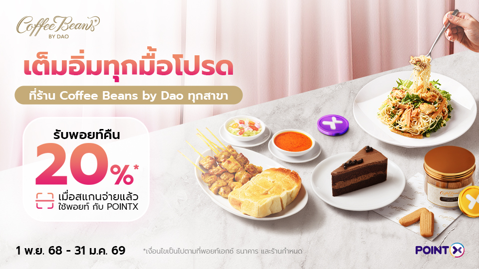 เต็มอิ่มทุกมื้อโปรด ที่ร้าน Coffee Beans by Dao ทุกสาขา รับพอยท์คืน 20% เมื่อสแกนจ่ายแล้วใช้พอยท์กับ POINTX