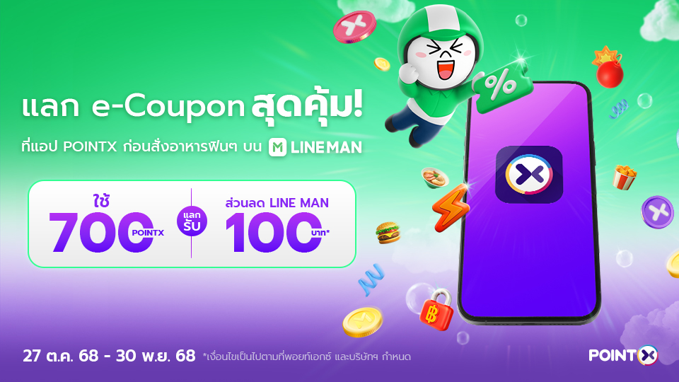 - สิทธิพิเศษนี้สำหรับลูกค้าบริษัท พอยท์เอกซ์ จำกัด (“พอยท์เอกซ์”) ที่เป็นสมาชิก POINTX Application แลกคะแนน 700 POINTX ผ่านแอปพลิเคชัน POINTX เพื่อรับโค้ดส่วนลด LINE MAN Food ใช้เป็นส่วนลดมูลค่า 100 บาท เมื่อสั่งอาหารขั้นต่ำ 150 บาท ตั้งแต่วันที่ 27 ตุลาคม 2568 – 30 พฤศจิกายน 2568 เท่านั้น