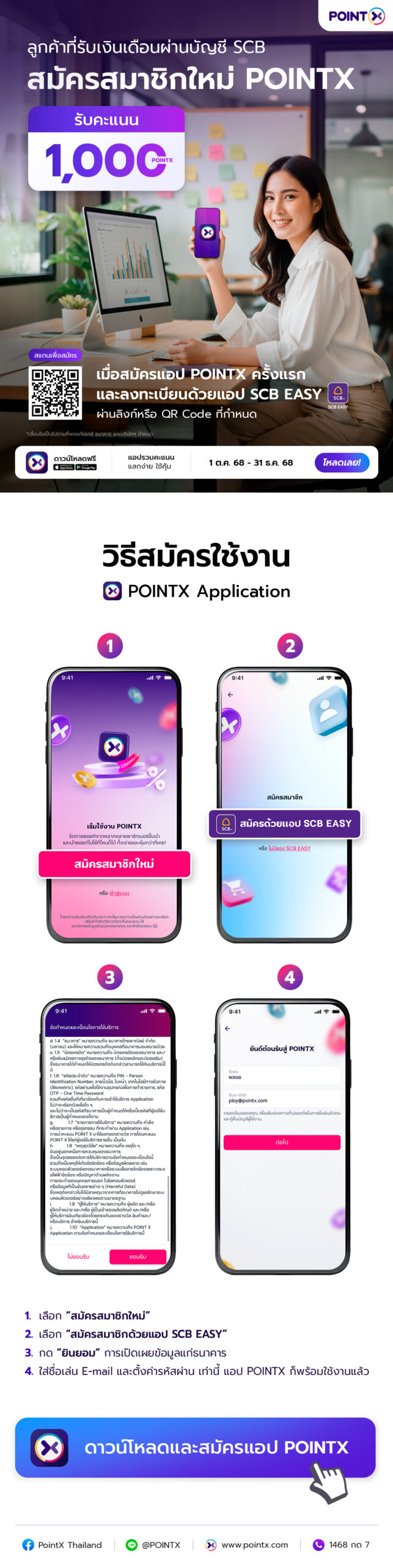 - สิทธิพิเศษนี้สำหรับลูกค้าบริษัท พอยท์เอกซ์ จำกัด (“พอยท์เอกซ์”) ที่ใช้บริการรับเงินเดือนผ่านบัญชี SCB (SCB Payroll) และได้ลงทะเบียนใช้งาน POINTX Application เป็นครั้งแรกผ่าน SCB EASY Application โดยการลงทะเบียนต้องทำผ่านลิงก์ หรือ QR Code ที่กำหนด ระหว่างวันที่ 1 ตุลาคม ถึง 31 ธันวาคม 2568