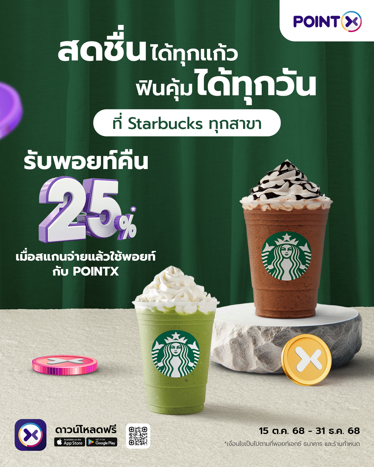 • รับพอยท์คืน 25% เมื่อสแกนจ่ายด้วยคะแนน POINTX ผ่าน QR พร้อมเพย์ ที่ร้าน Starbucks ทุกสาขา